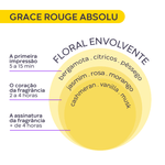Desarrollado para transmitir poder, sofisticación y sensualidad, Grace Rouge Absolu es el primer Deo Parfum femenino de la línea Grace. Creado para elevar tu presencia a un nivel premium, combina lo mejor de las notas florales y frutales con acordes intensos y envolventes que realzan tu personalidad.